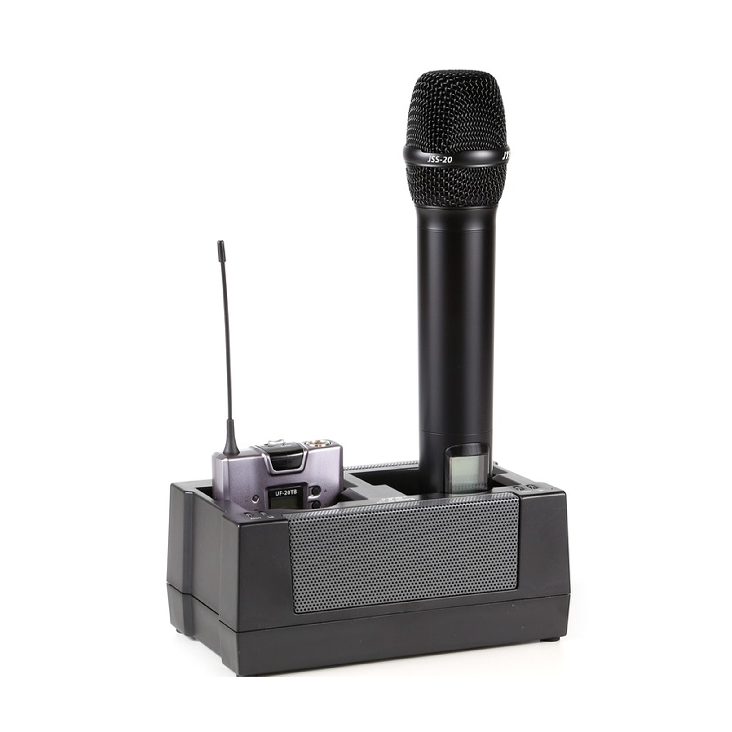 The JTS CH-2 is our 2 way intelligent charging doc. This provides a convenient place to store the microphone whilst silently charging the AA batteries. Auto off prevents overcharging. It is able to charge either handhelds or body packs , max 2 at a time. Charge time 3 Hour