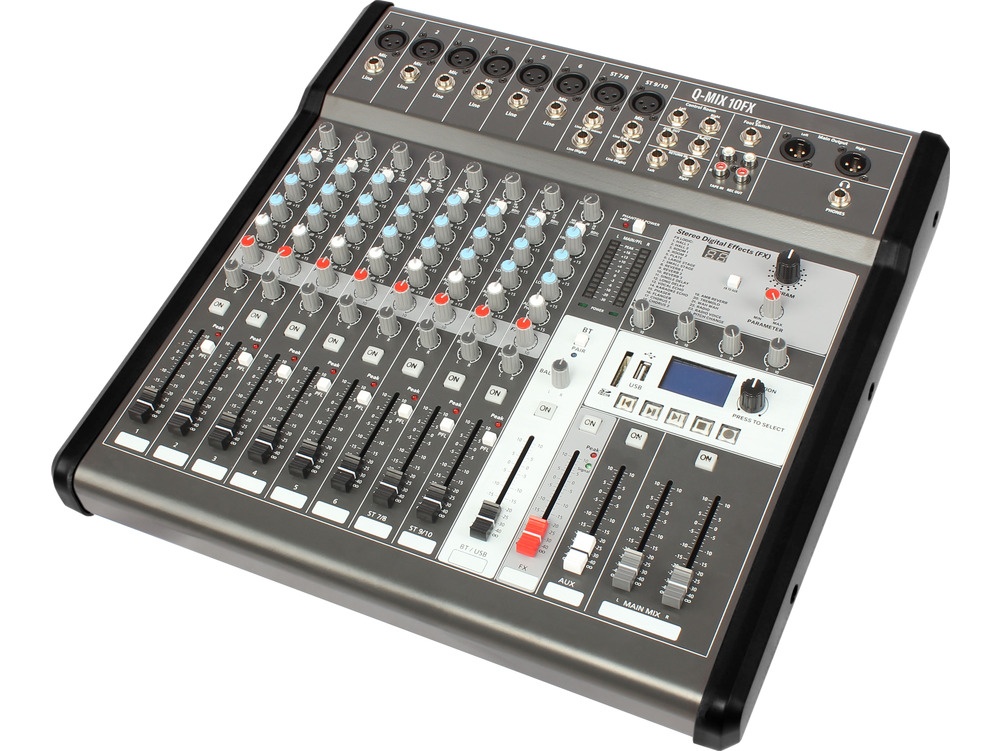 10-channel mixer with 24 digital effects, built-in MP3 player, Bluetooth, MP3/WAV recorder and 2-in/2-out USB audio interface. AUX and FX sends, plus 12-bar LED metering.