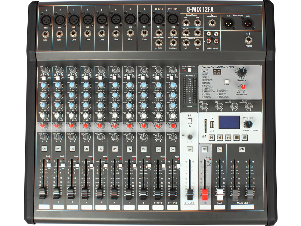 12-channel mixer with 24 digital effects, MP3 player, Bluetooth, MP3/WAV recorder and 2-in/2-out USB audio interface. AUX and FX sends, plus 12-bar LED metering.