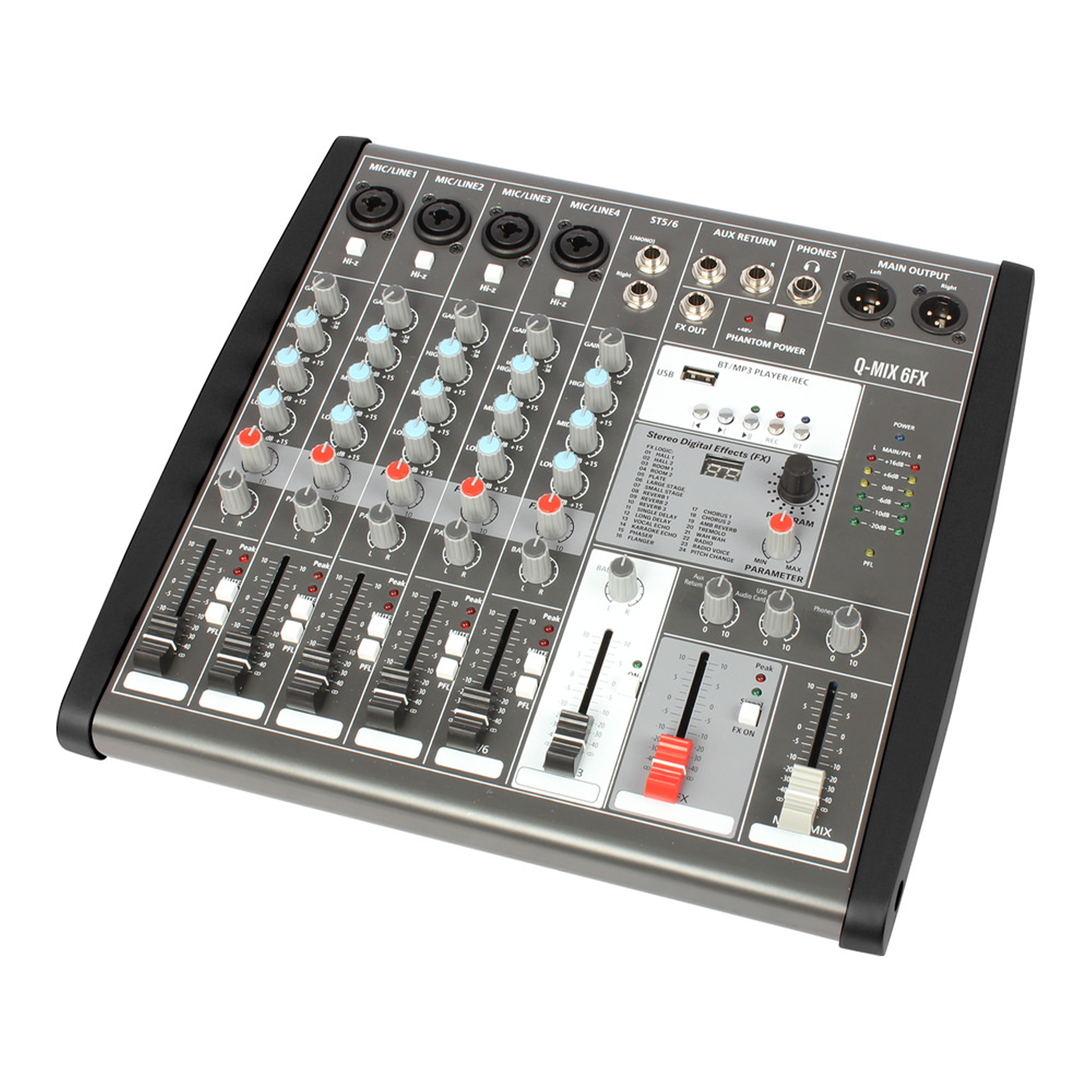The Q-MIX 6FX is a portable, feature-rich 6-channel mixer designed for live streaming, home recording, karaoke, conferencing and outdoor performances. It includes 4 mic inputs with +48V phantom power, 1 stereo input and independent 3-band EQ on every microphone channel for precise sound shaping.