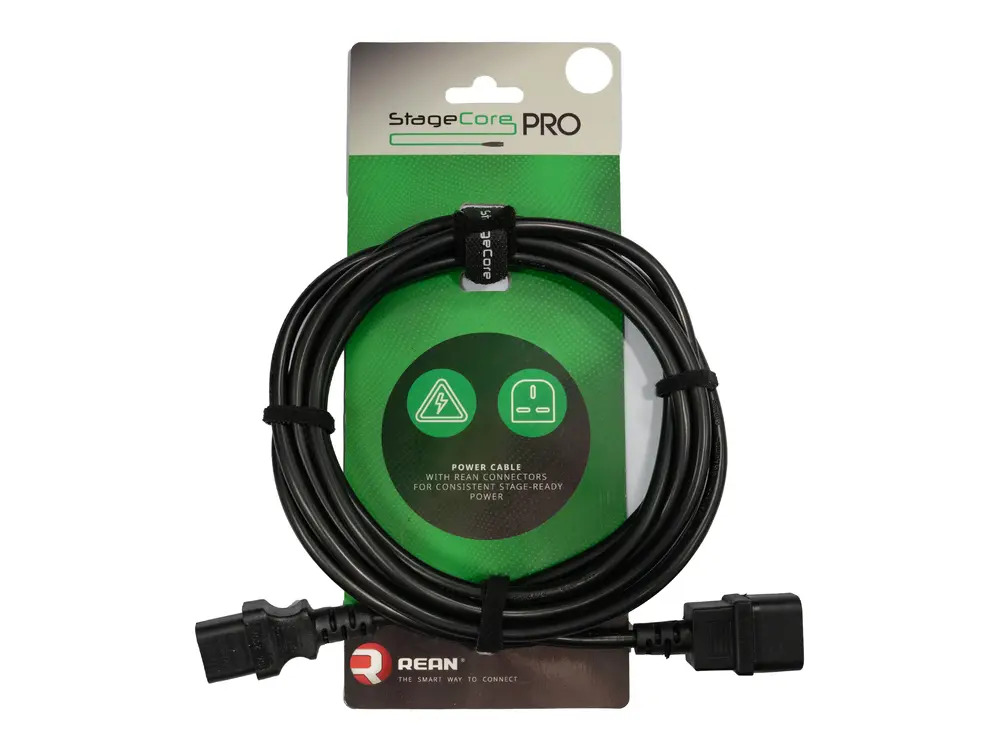 StageCore extension cable with IEC C14 to IEC C13 connectors. Commonly used for linking power between rack-mounted AV equipment including DSPs, switchers and power distribution units. Durable construction and flexible design make it suitable for touring, broadcast and fixed installation use.
