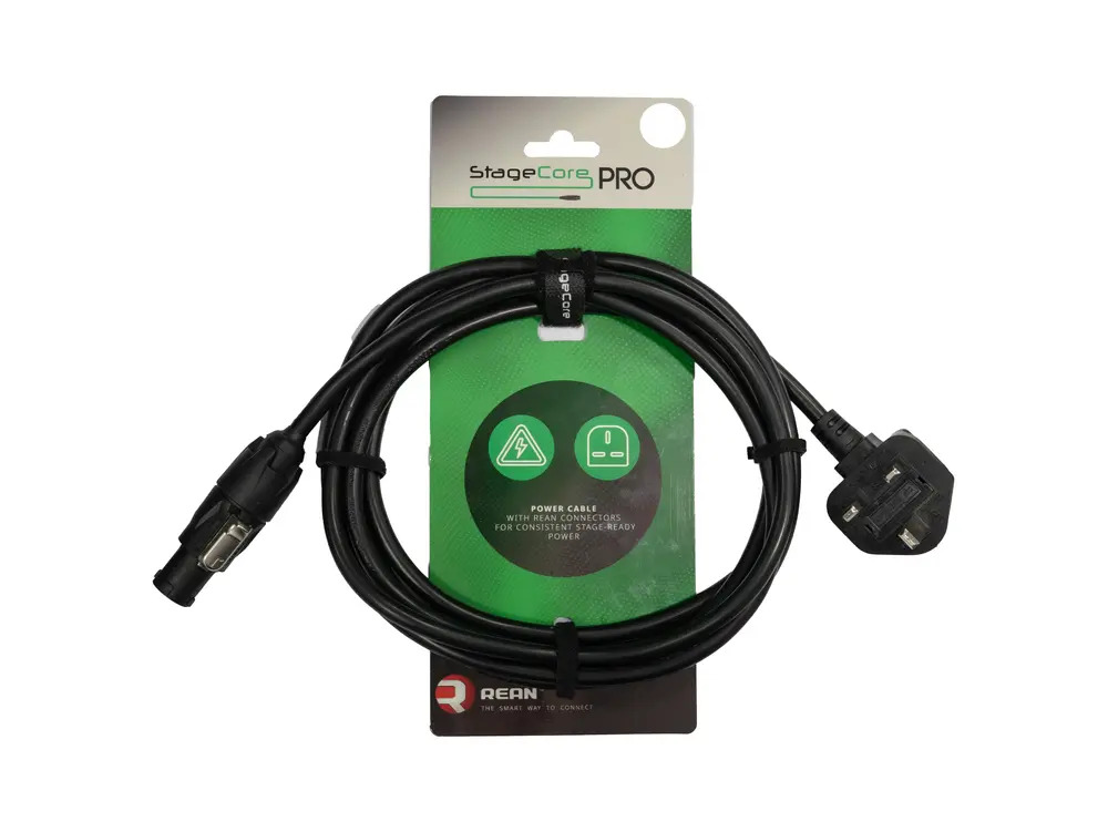 StageCore power cable with a UK plug and REAN TRUE1 locking connector. Designed to connect professional AV equipment directly to mains power. Ideal for active loudspeakers, lighting fixtures and signal processors requiring a secure and stable power input.